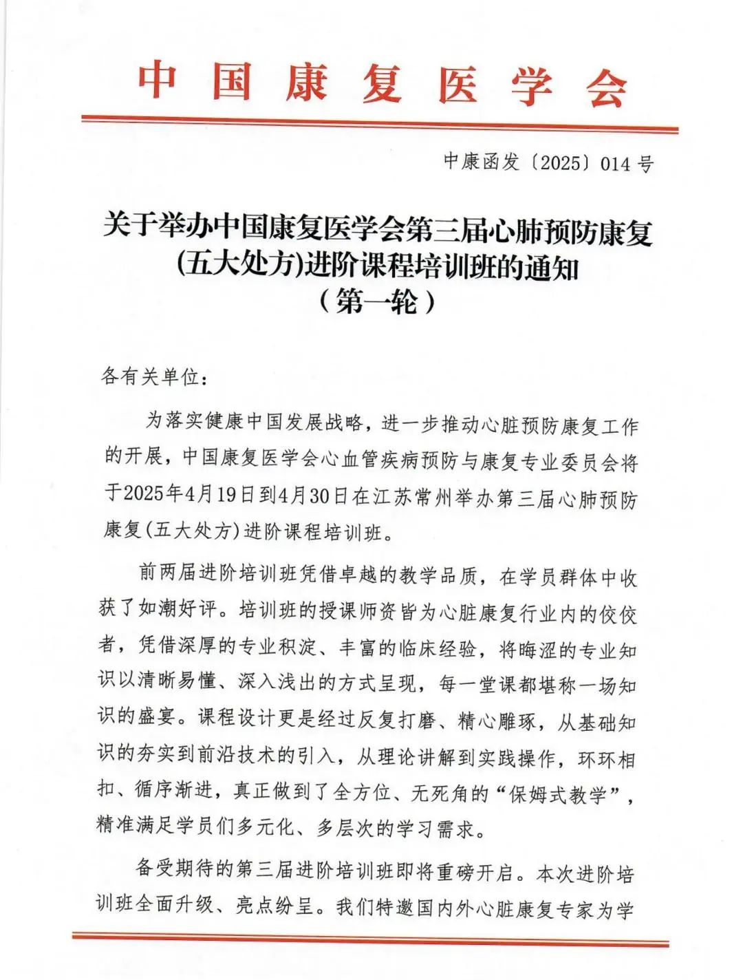 各有关单位:为落实健康中国发展战略,进一步推动心脏预防康复工作的开展,中国康复医学会心血管疾病预防与康复专业委员会将于2025年4月19日—4月30日在江苏常州举办第三届心肺预防康复(五大处方…