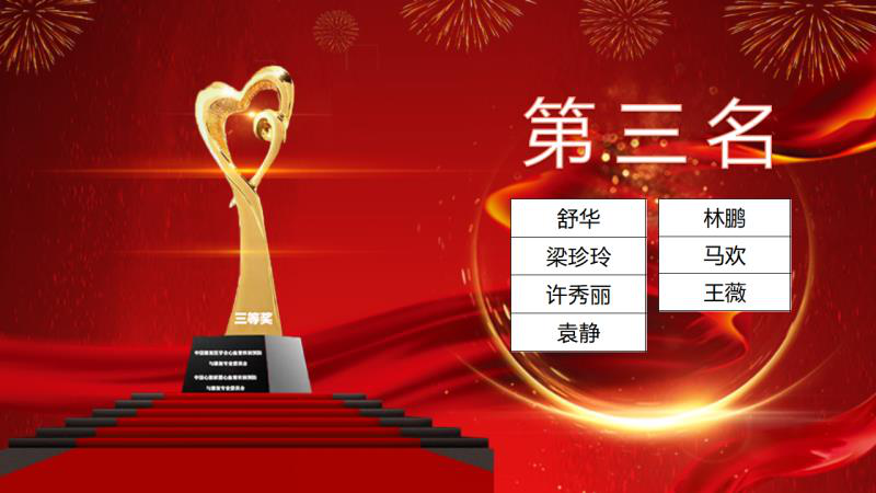 孟晓萍教授组织颁奖仪式:由益盛药业股份有限公司总经理李双合先生宣读心悦杯三等奖名单,中华医学会心血管分会心脏康复学组组长杨新春教授宣读心悦杯二等奖名单,中国康复学会血管疾病预防及康复学会副主委王乐民教授宣读心悦杯一等奖名单 。参赛选手为优秀奖。中国心脏康复联盟心血管疾病预防与康复专业委员会主任委员孟晓萍宣读心悦杯人气之星奖。