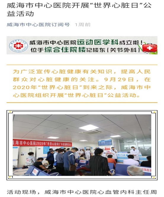 9月29日,在2020年“世界心脏日”到来之际,威海市中心医院在心血管门诊大厅组织开展“世界心脏日”公益活动。