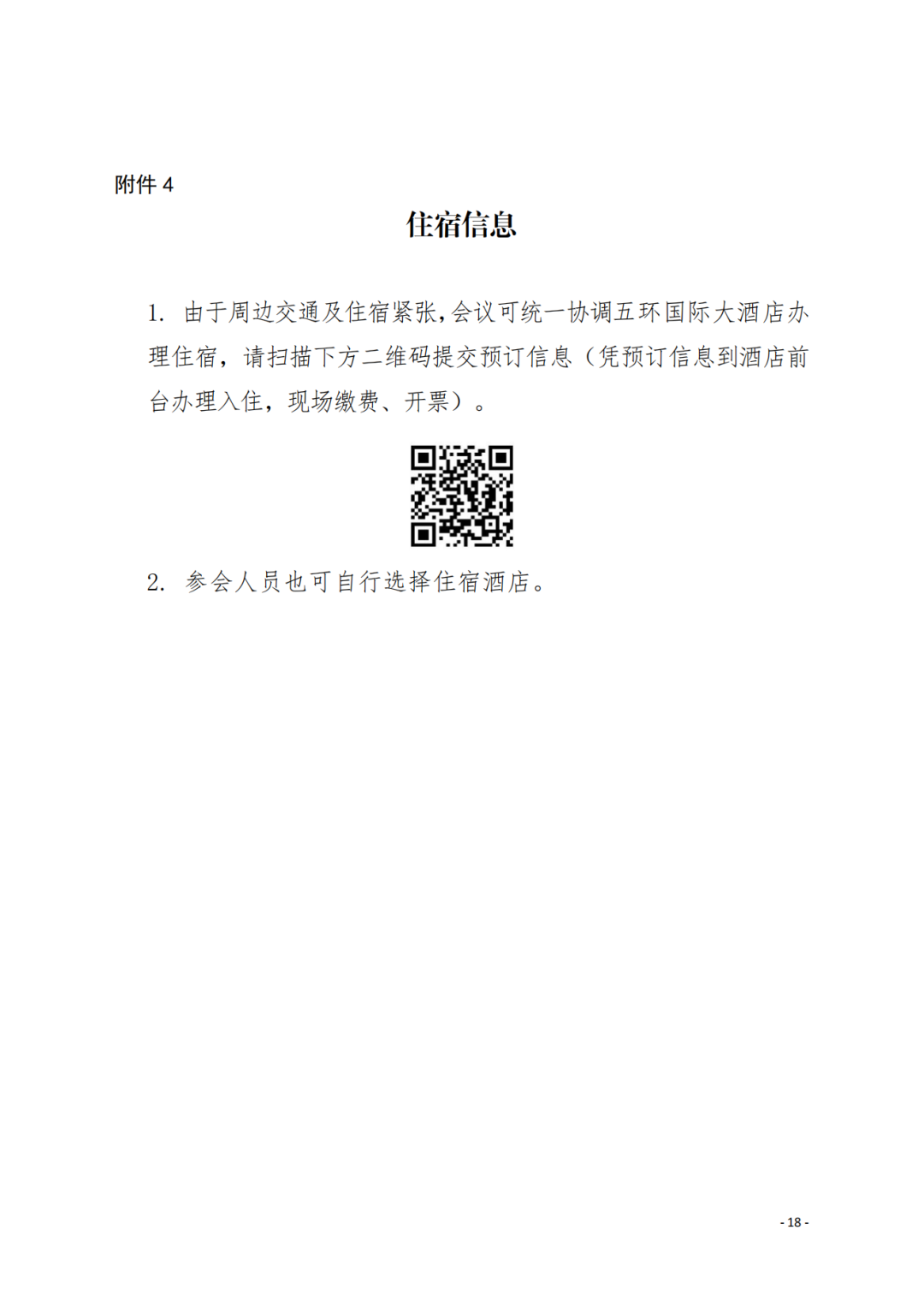 1.由于周边交通及住宿紧张,会议可统一协调五环国际大酒店办理住宿,请扫描下方二维码提交预订信息(凭预订信息到酒店前台办理入住,现场缴费、开票)。